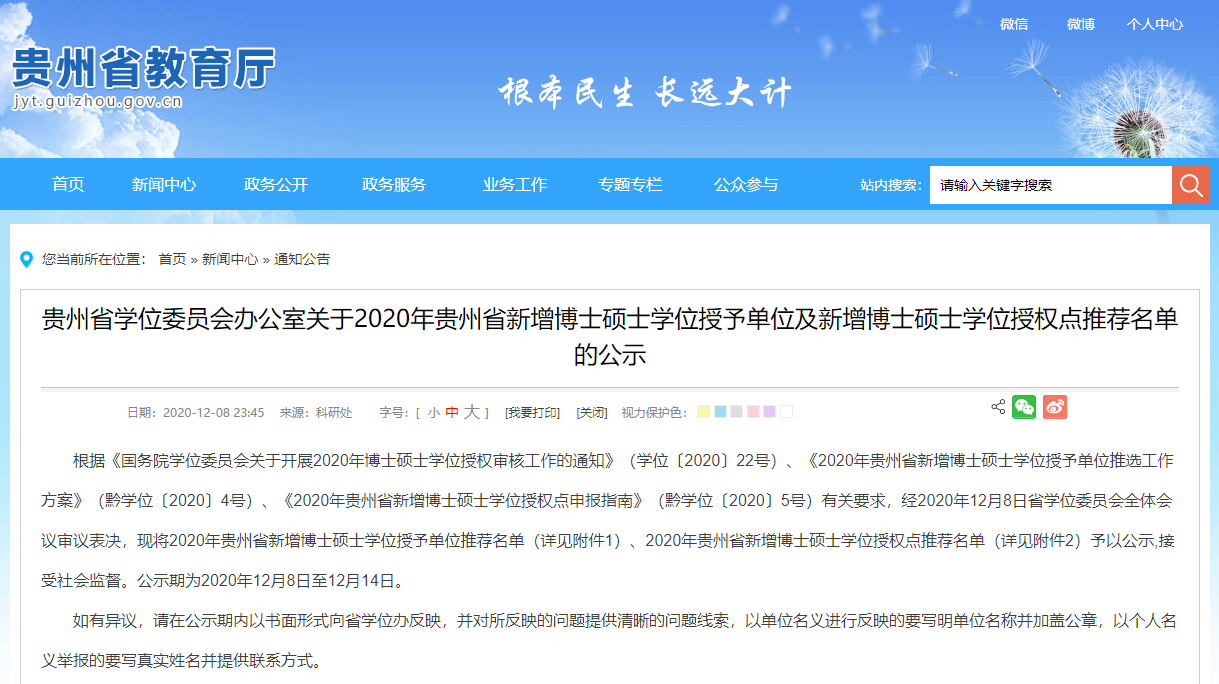 貴州省學位委員會辦公室關于2020年貴州省新增博士碩士學位授予單位及新增博士碩士學位授權點推薦名單的公示
