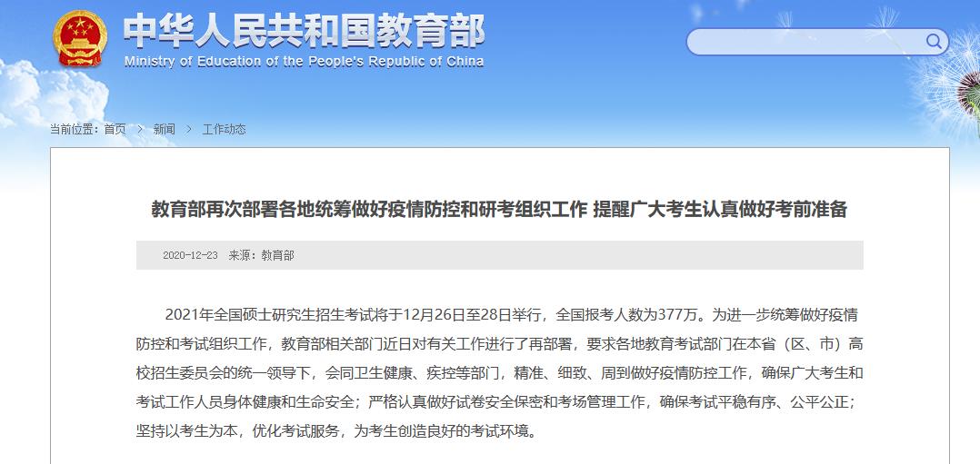 為進一步統籌做好疫情防控和考試組織工作,教育部相關部門近日對有關工作進行了再部署,要求各地教育考試部門在本省(區、市)高校招生委員會的統一領導下,會同衛生健康、疾控等部門,精準、細致、周到做好疫情防控工作,確保廣大考生和考試工作人員身體健康和生命安全;嚴格認真做好試卷安全保密和考場管理工作,確保考試平穩有序、公平公正;堅持以考生為本,優化考試服務,為考生創造良好的考試環境。