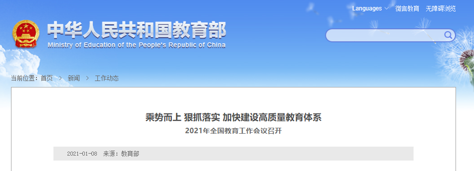 1月7日至8日,2021年全國教育工作會議在京召開。會議強調要乘勢而上,狠抓落實,加快建設高質量教育體系。以下是“2021年全國教育工作會議順利在京召開!”的全部內容。