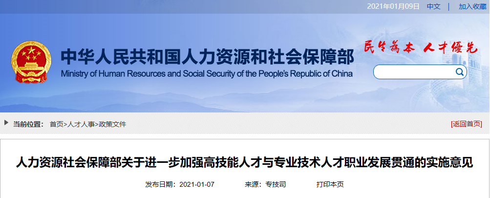 人力資源社會(huì)保障部關(guān)于進(jìn)一步加強(qiáng)高技能人才與專業(yè)技術(shù)人才職業(yè)發(fā)展貫通的實(shí)施意見(jiàn)發(fā)布
