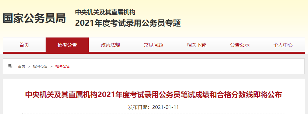 1月11日,國家公務(wù)員局發(fā)布“中央機關(guān)及其直屬機構(gòu)2021年度考試錄用公務(wù)員筆試成績和合格分數(shù)線即將公布”,以下是原文內(nèi)容。