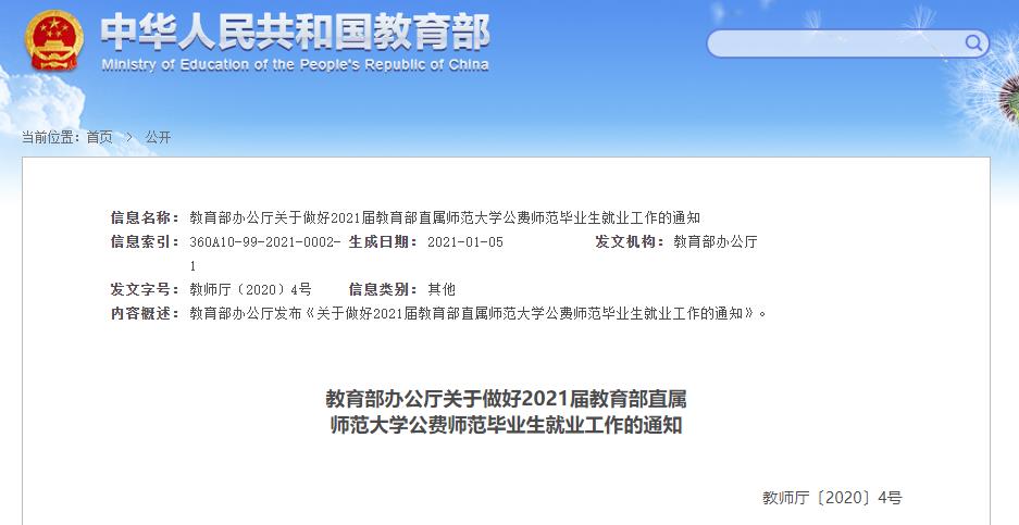教育部辦公廳關(guān)于做好2021屆教育部直屬師范大學公費師范畢業(yè)生就業(yè)工作的通知