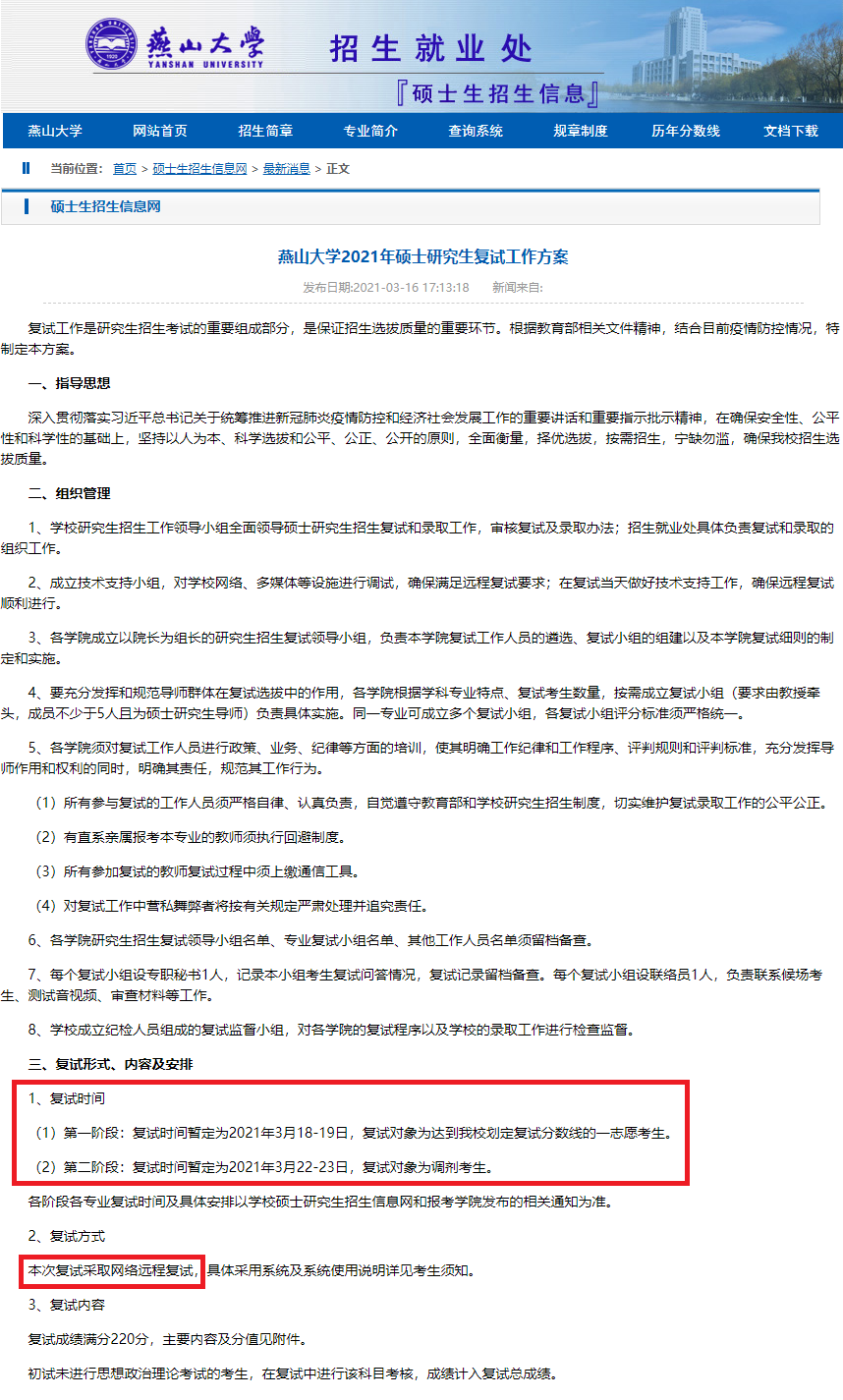 (2)第二階段:復試時間暫定為2021年3月22-23日,復試對象為調劑考生。
