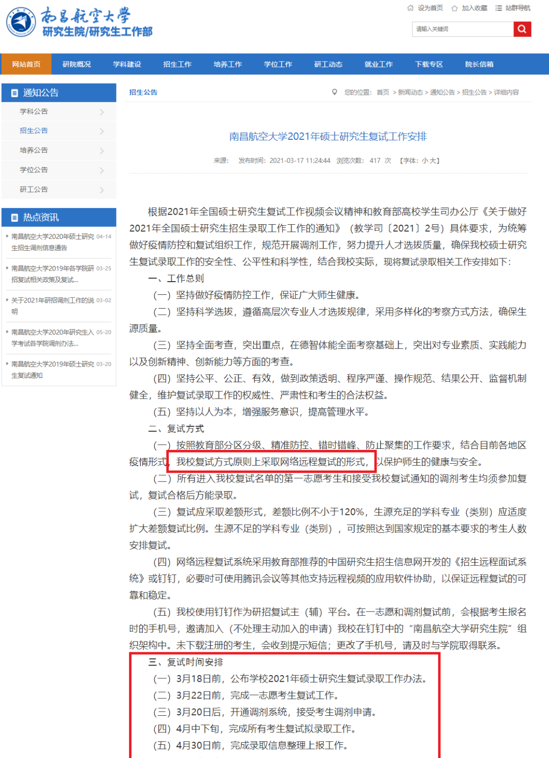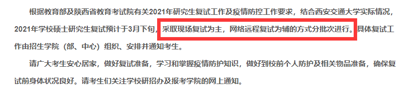 復試公告里面有復試時間、復試方式、復試內容以及復試條件要求,可解答同學們有關“什么時候參加復試?現場復試還是網絡復試?都需要做哪些準備?”等復試疑問。今年有哪些院校究是網絡復試呢?哪些院校是線下復試?