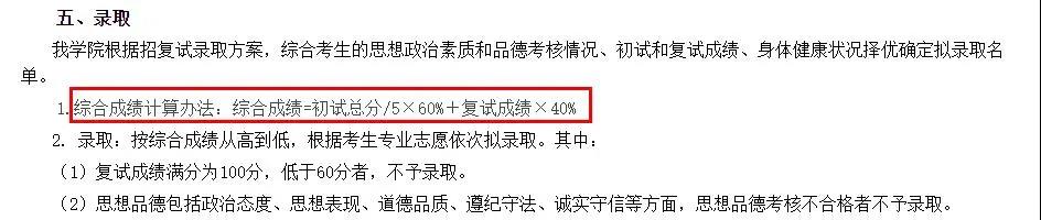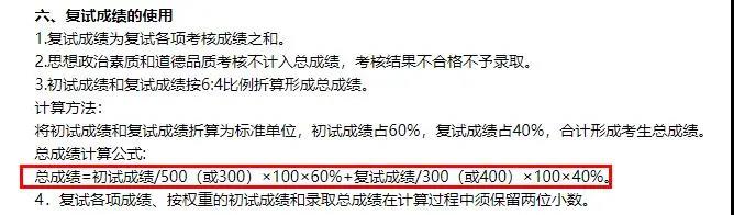 總成績=初試成績/500(或300)×100×60%+復試成績/300(或400)×100×40%。