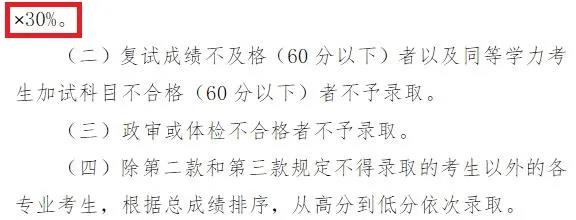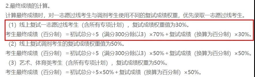 (1)線上復試一志愿過線考生(含所有專項計劃),復試成績權重值為30%。