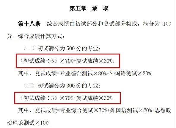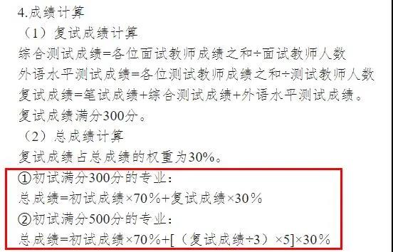 考生最終成績(百分制)=初試總分÷5(滿分300分除以3)×70%+復試成績(換算為百分制)×30%。