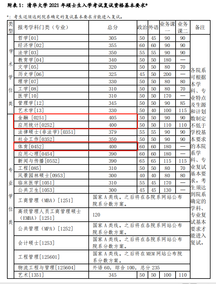 《清華大學2021年碩士研究生招生復試基本分數線》中:金融專碩的復試線是405;應用統計(專碩)的復試線是400整;體育專碩的復試線400整。