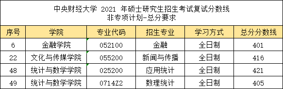 在《中央財經大學2021年碩士研究生招生考試復試分數線》中可以看到,金融學院-金融專業的復試分數線為401分;文化與傳媒學院-新聞與傳播專業復試線為416分;統計與數學學院-應用統計專業和數理統計專業復試線也均在400分以上。