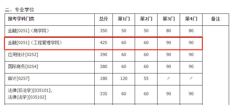 在《南京大學2021年碩士招生考試復試基本分數線及相關說明》中可以看到,今年其專業學位金融[0251](商學院)的復試分數線為425分。