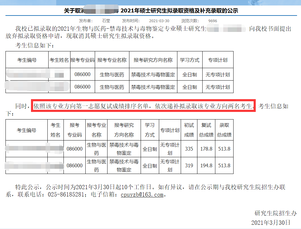 中國(guó)藥科大學(xué)生物與醫(yī)藥專業(yè)2名同學(xué)書(shū)面提出放棄擬錄取資格申請(qǐng),依照該專業(yè)方向第一志愿復(fù)試成績(jī)排序名單,依次遞補(bǔ)擬錄取該專業(yè)方向兩名考生。