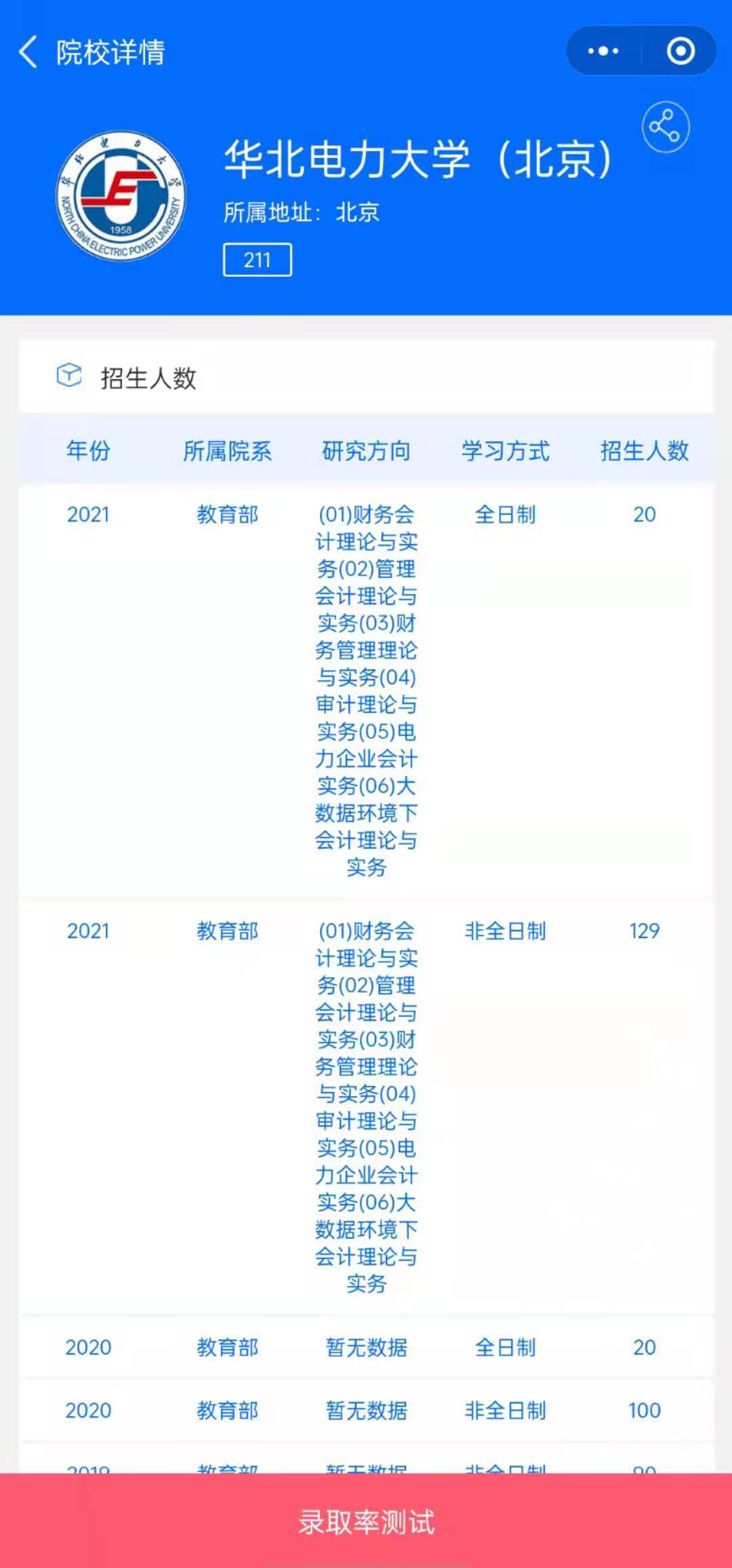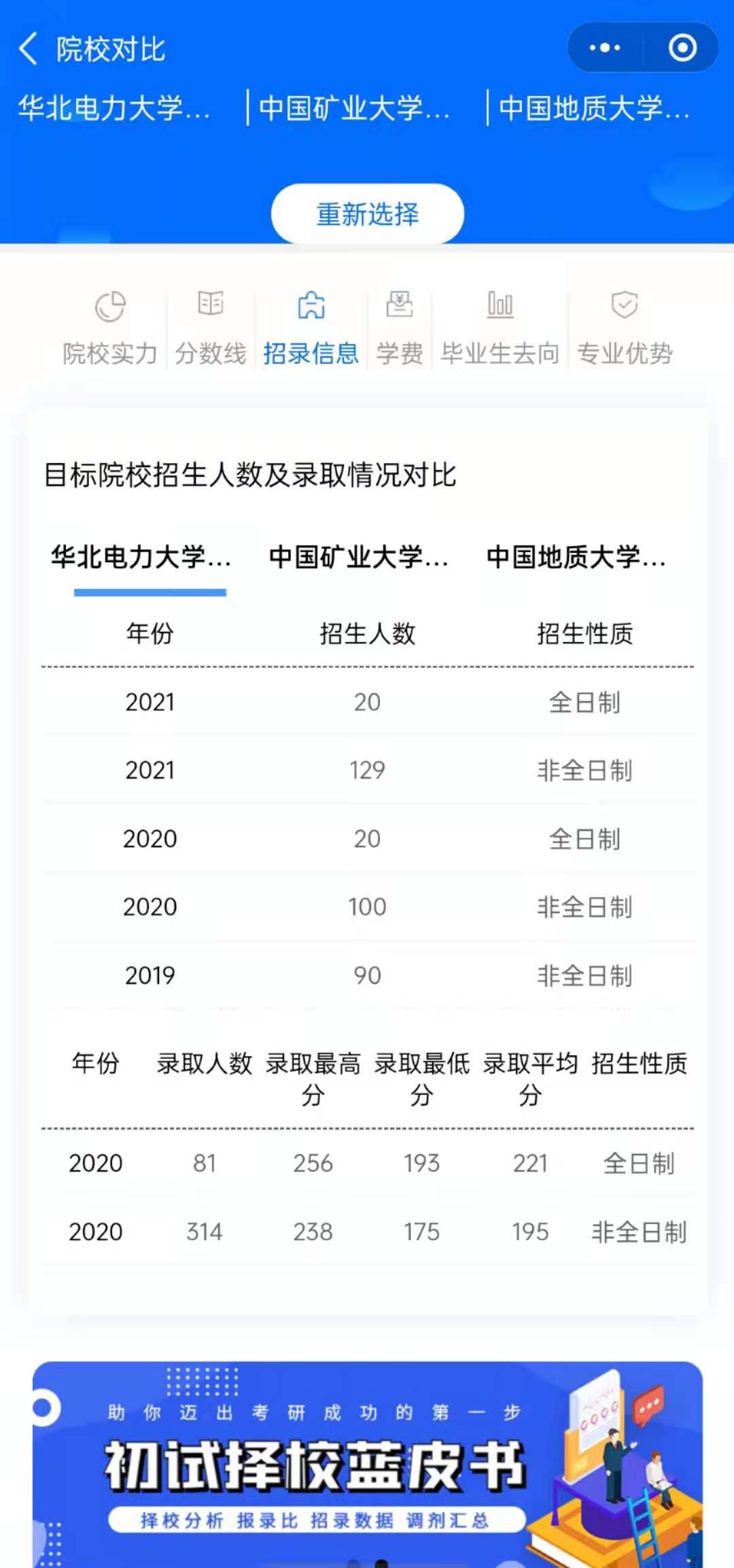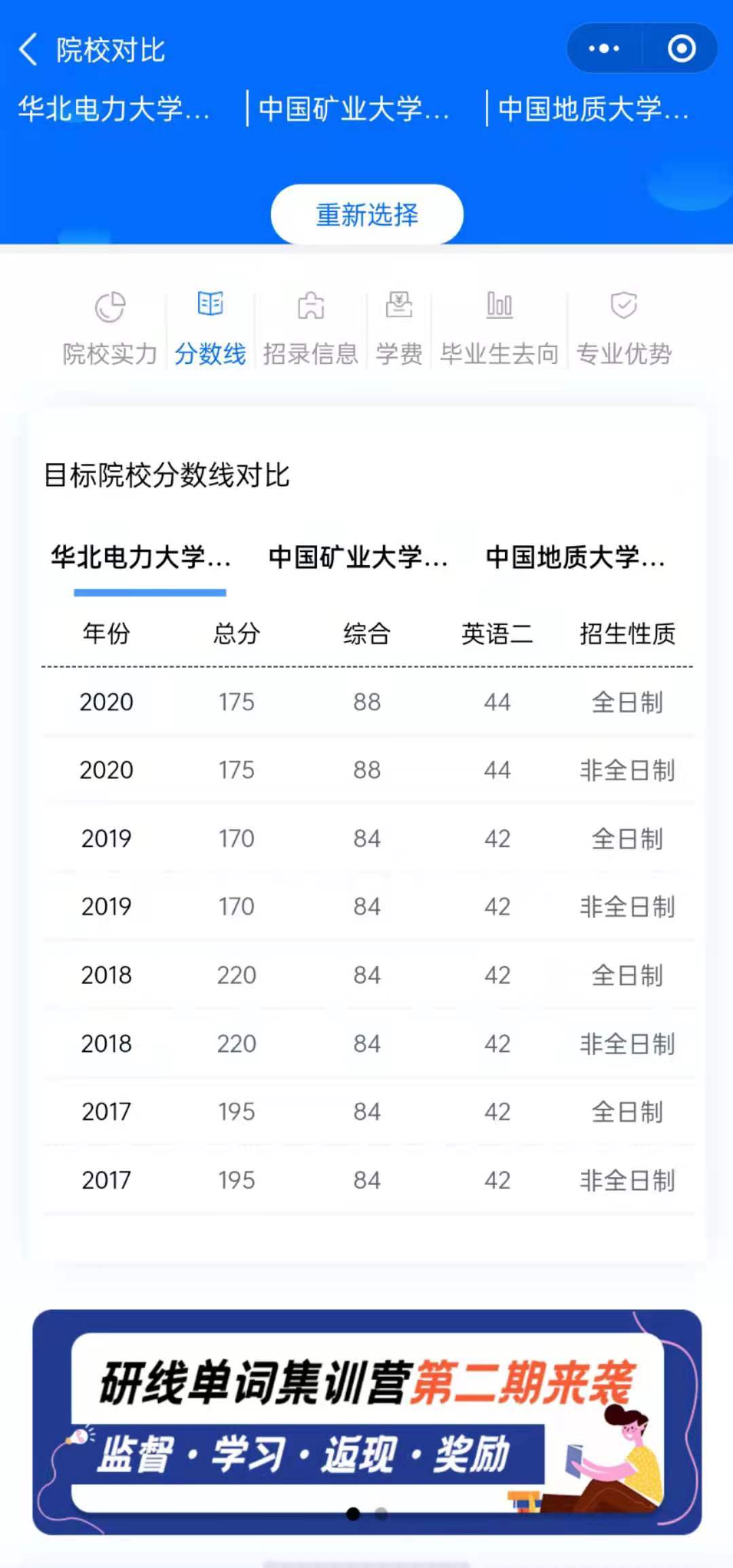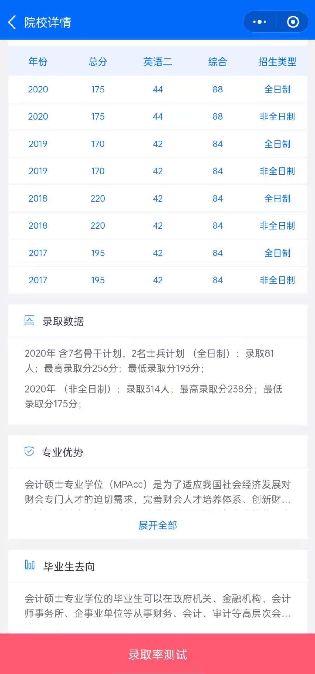 MPAcc考研助手還提供院校對比功能,將心儀院校加入對比,小程序會(huì)直觀的提供對比院校的詳細(xì)對比數(shù)據(jù),包括:院校實(shí)力、分?jǐn)?shù)線、招錄信息、學(xué)費(fèi)、畢業(yè)生去向、專業(yè)優(yōu)勢,幫助考生進(jìn)一步精準(zhǔn)擇校。