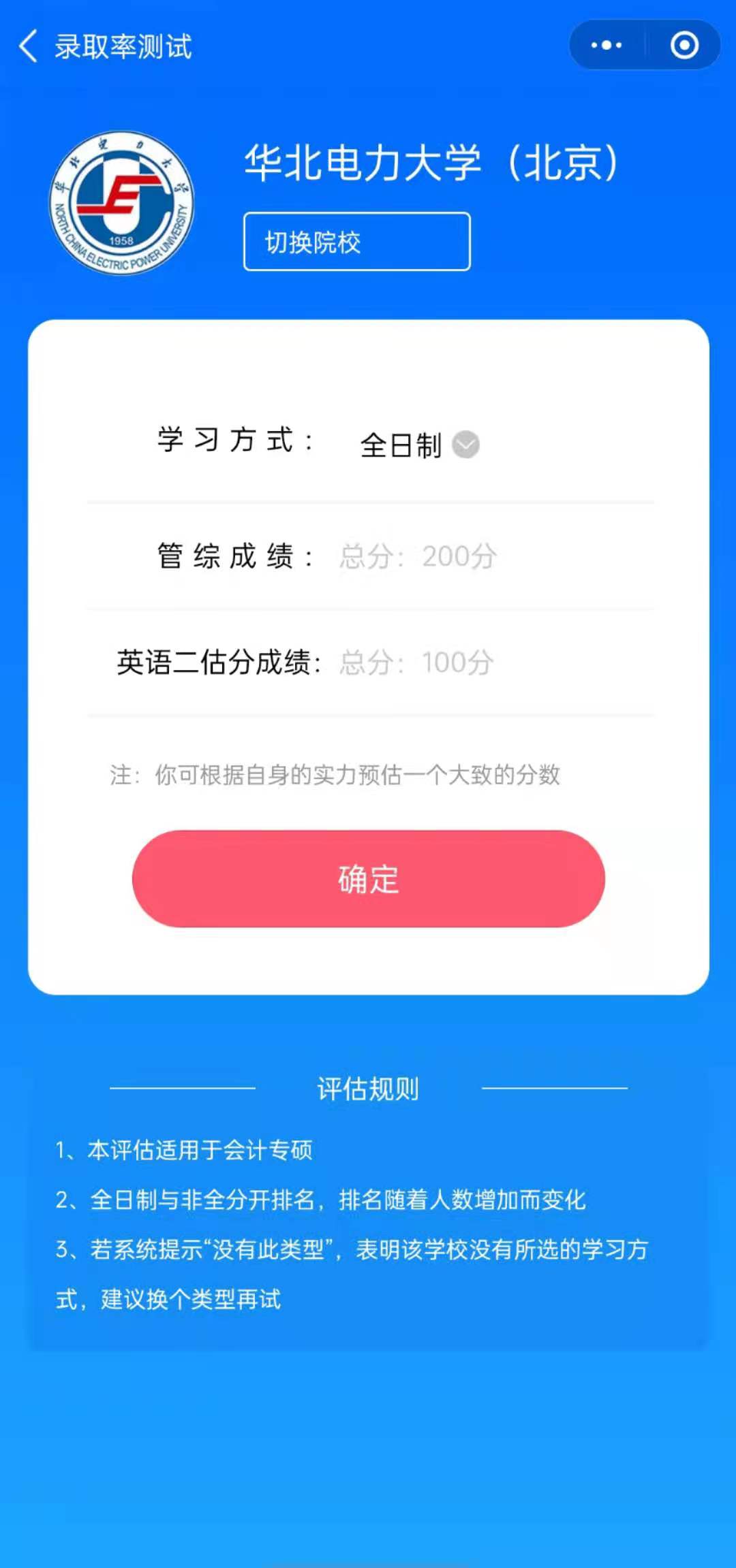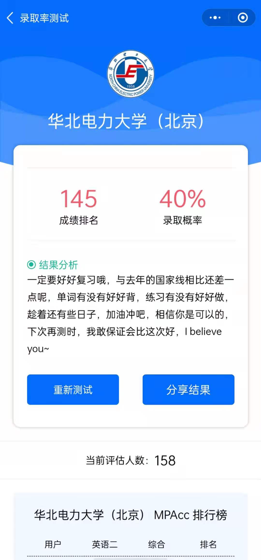 考生選好心儀的院校后,可以根據(jù)自己的復(fù)習(xí)情況輸入預(yù)估的管綜成績、英語成績進(jìn)行錄取率測試。測試結(jié)果中提供成績排名、錄取概率以及結(jié)果分析,還可以根據(jù)其他用戶的錄取率情況查看自己的排名。