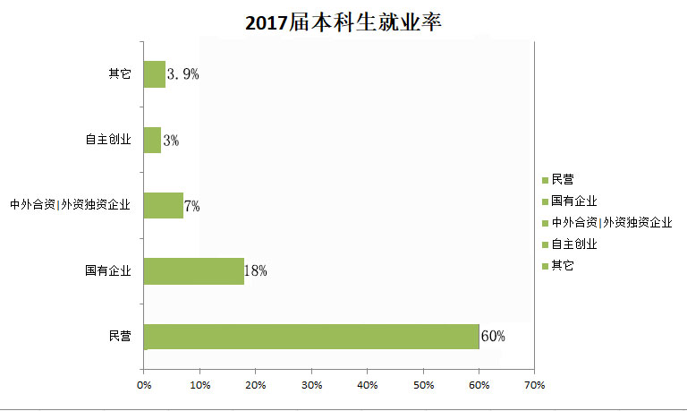 2017屆本科生畢業(yè)半年后就業(yè)率為91.9%,其中在民營企業(yè)60%,國有企業(yè)18%,中外合資|外資獨資企業(yè)7%,自主創(chuàng)業(yè)3%,其它3.9%。