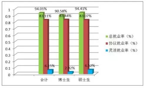 2016屆畢業(yè)研究生就業(yè)率為94.01%(其中:博士畢業(yè)生為90.58%,碩士畢業(yè)生為94.41%)。協(xié)議就業(yè)人數(shù)為2485人,協(xié)議就業(yè)率為83.11%;靈活就業(yè)人數(shù)為184人,靈活就業(yè)率為6.15%。