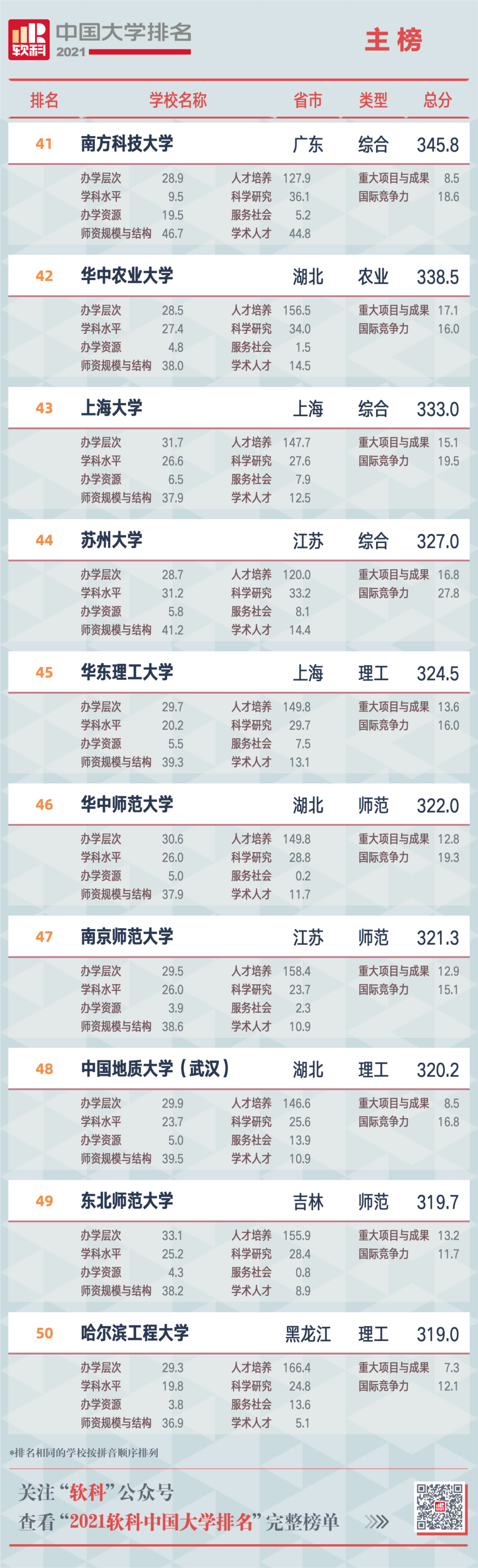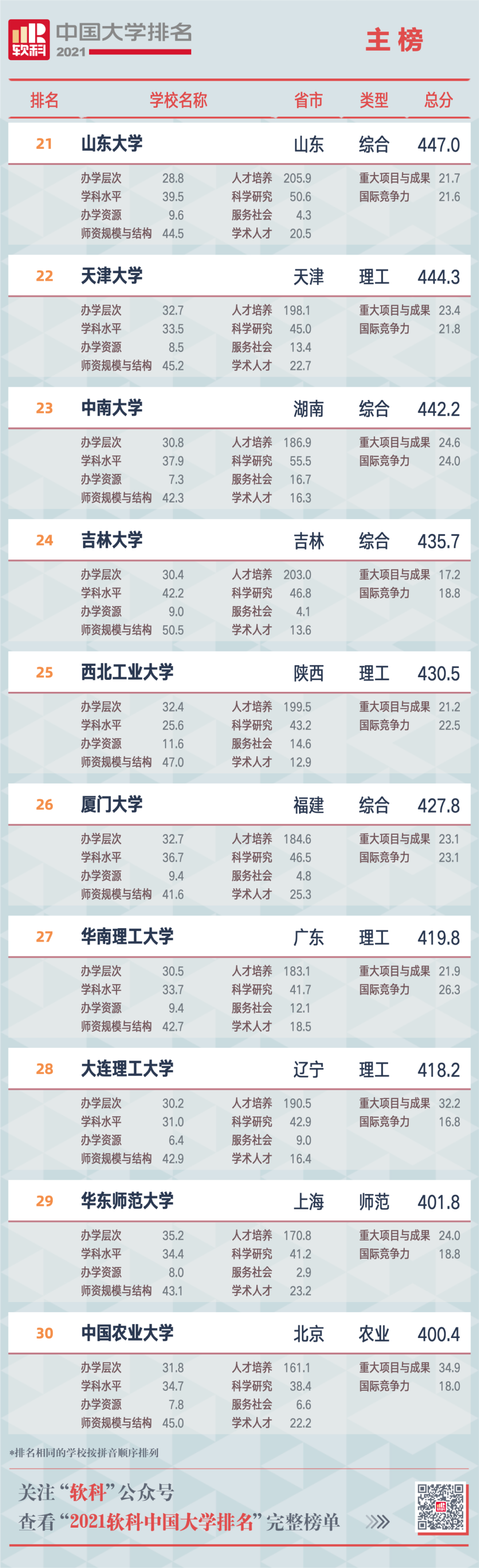 2021軟科中國(guó)大學(xué)排名(主榜)的上榜高校共有582所,清華大學(xué)、北京大學(xué)、浙江大學(xué)占據(jù)前三,上海交通大學(xué)、南京大學(xué)位列全國(guó)前五。其他位列全國(guó)前十名的大學(xué)依次為復(fù)旦大學(xué)(第六)、中國(guó)科學(xué)技術(shù)大學(xué)(第七)、華中科技大學(xué)(第八)、武漢大學(xué)(第九)、西安交通大學(xué)(第十)。西安交通大學(xué)相較2020年排名上升1名,首次入圍全國(guó)十強(qiáng)。西安交通大學(xué)堅(jiān)持“扎根西部、服務(wù)國(guó)家、世界一流”的辦學(xué)定位,建設(shè)世界一流研究型大學(xué)的愿景已現(xiàn)曙光。