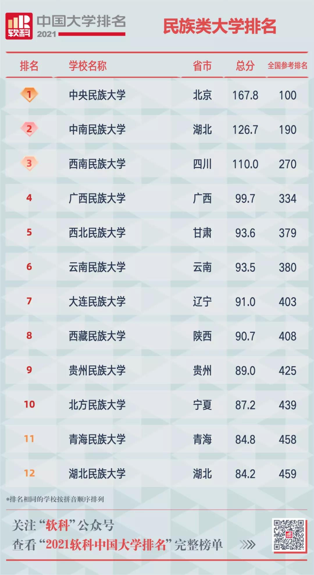 2021軟科中國(guó)民族類大學(xué)排名的上榜高校有12所,中央民族大學(xué)、中南民族大學(xué)、西南民族大學(xué)位列前三。