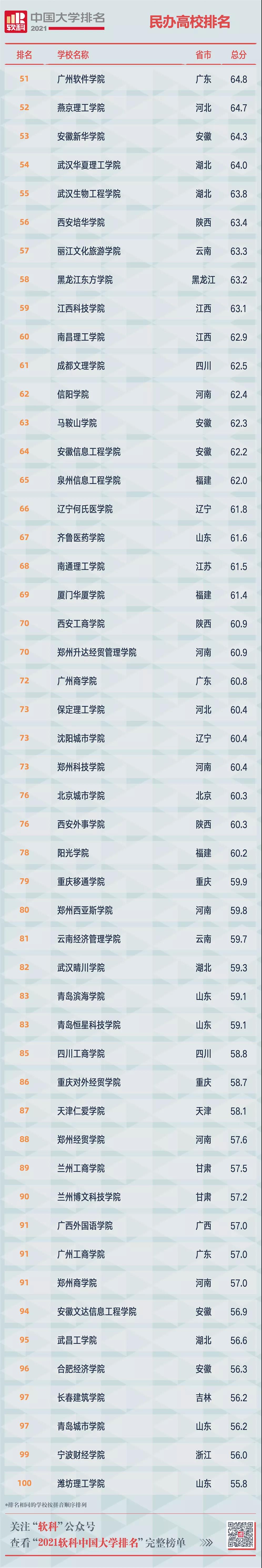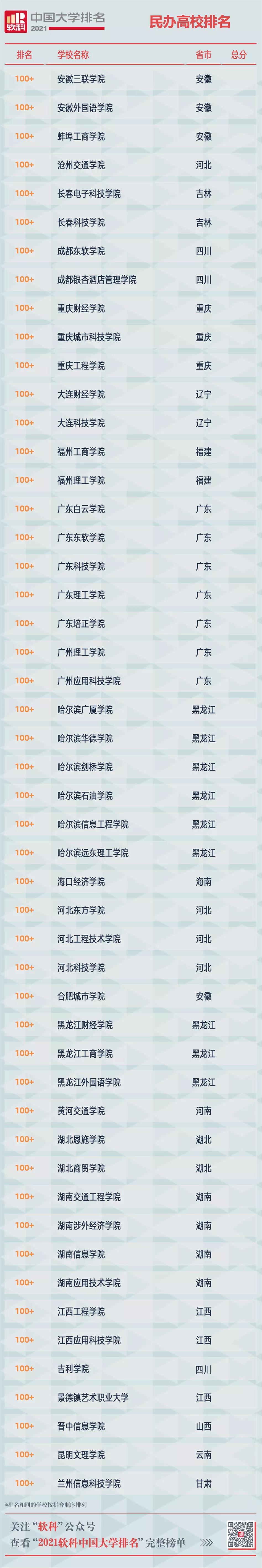 2021軟科中國(guó)民辦高校排名上榜高校共192所,排名最高的三所學(xué)校是吉林外國(guó)語(yǔ)大學(xué)、珠海科技學(xué)院、大連東軟信息學(xué)院。2021軟科中國(guó)民辦高校排名榜單中有46所是由獨(dú)立學(xué)院轉(zhuǎn)設(shè)而來(lái),其中23所位列2021中國(guó)民辦高校排名百?gòu)?qiáng),體現(xiàn)了率先完成轉(zhuǎn)設(shè)的這批獨(dú)立學(xué)院的辦學(xué)實(shí)力,他們的轉(zhuǎn)設(shè)將發(fā)揮示范作用,推動(dòng)中國(guó)民辦高等教育規(guī)范發(fā)展。