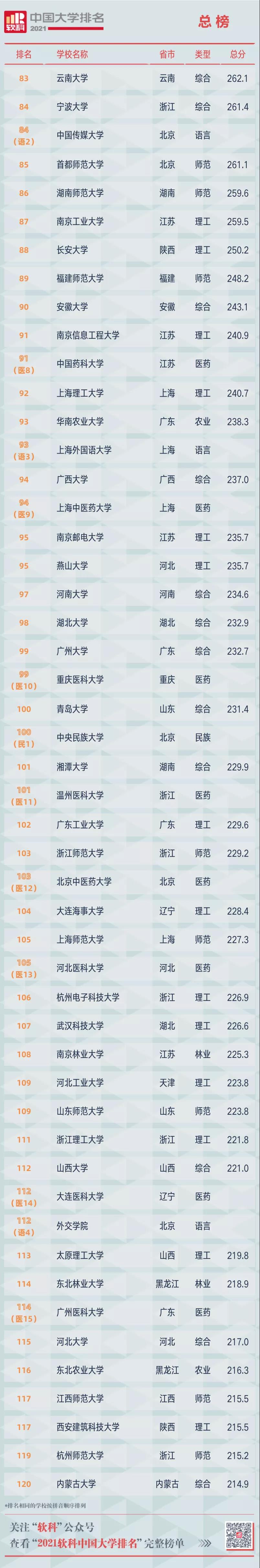 “雙一流”高校在排名中占絕對(duì)優(yōu)勢(shì)地位,百?gòu)?qiáng)高校中有86所為“雙一流”高校,其中廣西大學(xué)排名較2020年上升7名,躋身全國(guó)百?gòu)?qiáng),位列全國(guó)第94,至此“雙一流”高校在百?gòu)?qiáng)榜單再增一席。