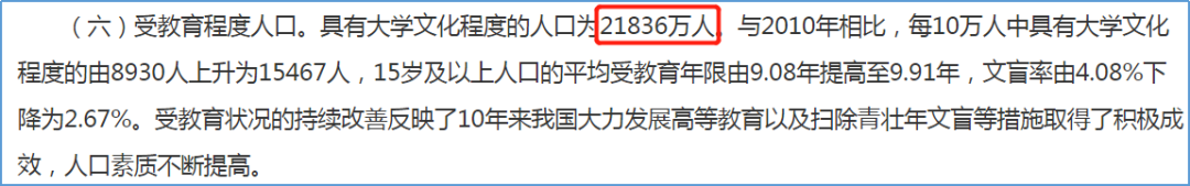 14億人口中,擁有大學文化程度的人已超2億,每十萬人中具有大學文化程度的人口比例依然持續增長,已達到15467人,同比增長73.2%!