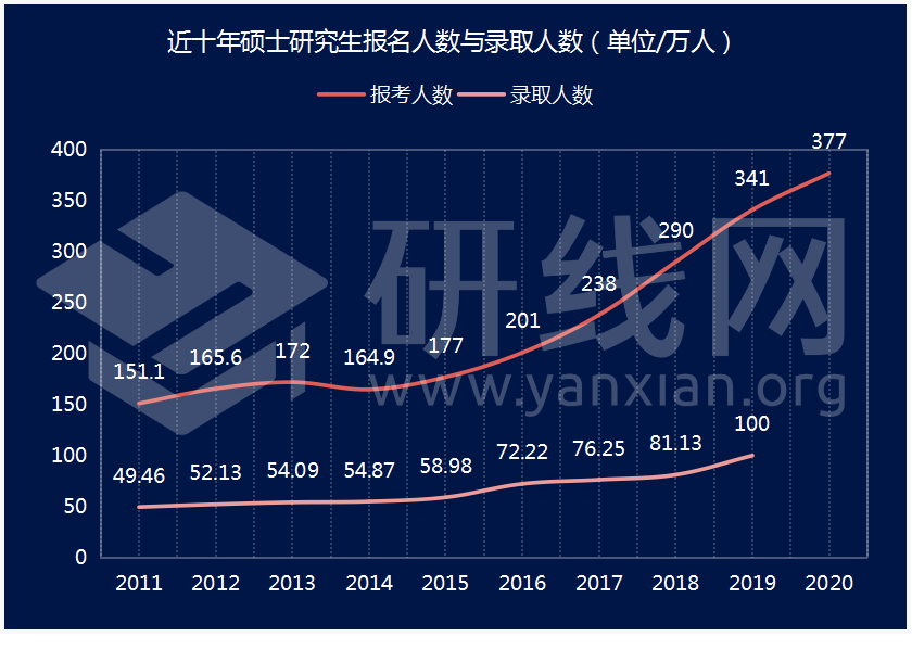 2020年我國研究生年招生首次突破100萬人,錄取人數達到110萬人,研究生在學人數將達到300萬人,已累計超過1000萬!