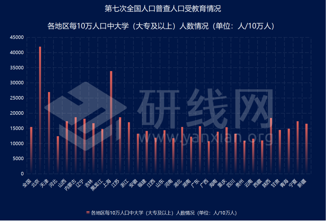 全國范圍內,考研競爭最激烈的當屬北京與上海。在這次的人口普查受教育情況中,兩地的情況也明顯超出其他地區。
