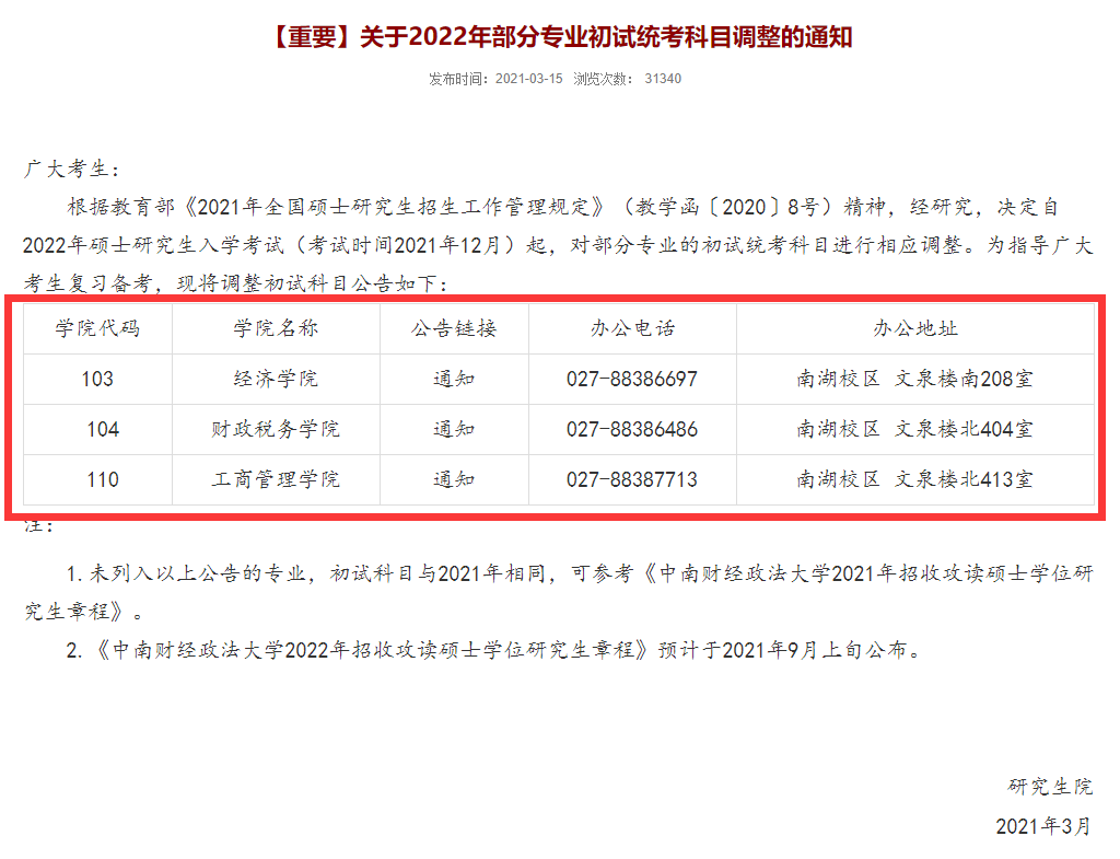 未列入以上公告的專業,初試科目與2021年相同,可參考《中南財經政法大學2021年招收攻讀碩士學位研究生章程》。