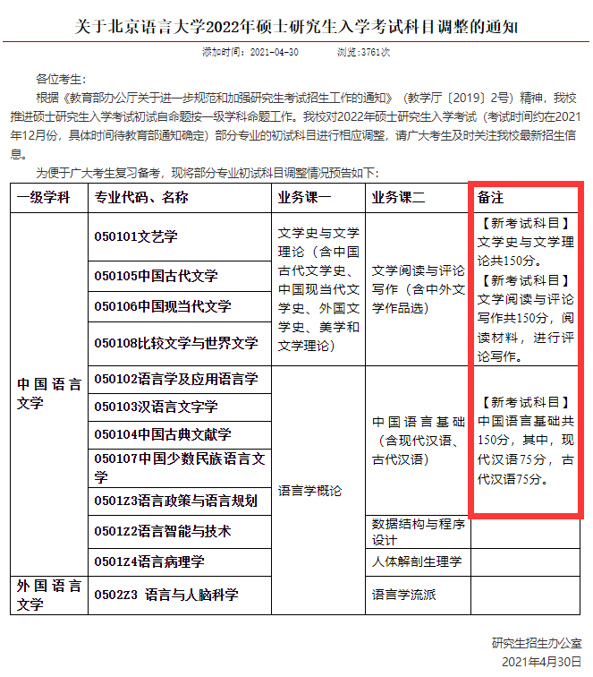 北京語言大學22考研部分專業初試科目調整情況如下表。