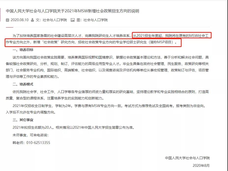 人大從2021年起,新增“社會政策”研究方向,招收社會政策專業方向的專業學位碩士研究生(簡稱MSP項目)。