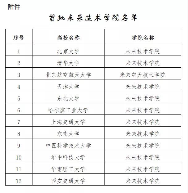 為貫徹落實習近平總書記關于教育的重要論述特別是在清華大學考察時的重要講話精神,推進新工科建設全面深化,加快未來技術學院建設,根據《教育部辦公廳關于印發〈未來技術學院建設指南(試行)〉的通知》(教高廳函〔2020〕6號)等文件要求,在高校自主申報、專家論證的基礎上,我部按相關工作程序確定了首批未來技術學院名單,現予公布(見附件)。