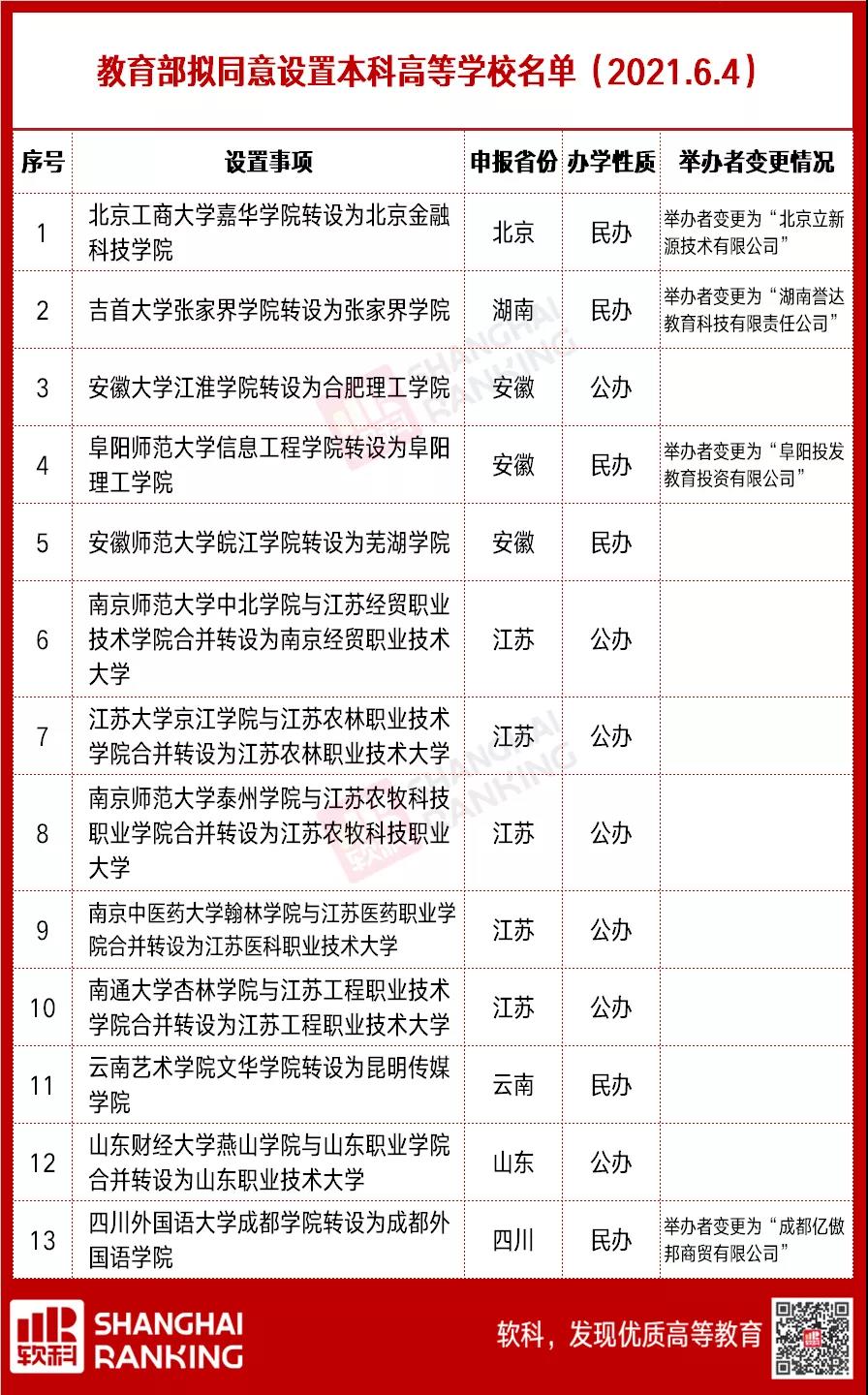 6月4日,教育部發布《關于擬同意設置本科高等學校的公示》,經第七屆全國高等學校設置評議委員會專家考察和評議,并經黨組會審議,擬同意北京工商大學嘉華學院等13所獨立學院轉設為獨立設置的本科學校,現將學校名單等信息向社會公示,一起來看~