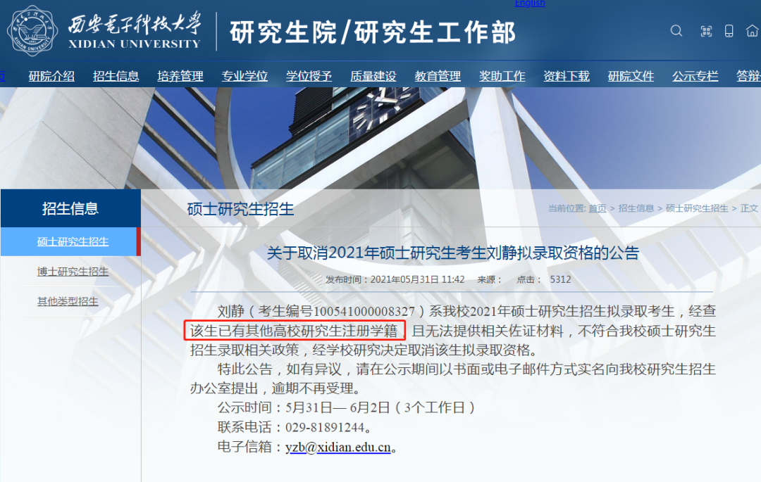 《關于取消2021年碩士研究生考生劉靜擬錄取資格的公告》