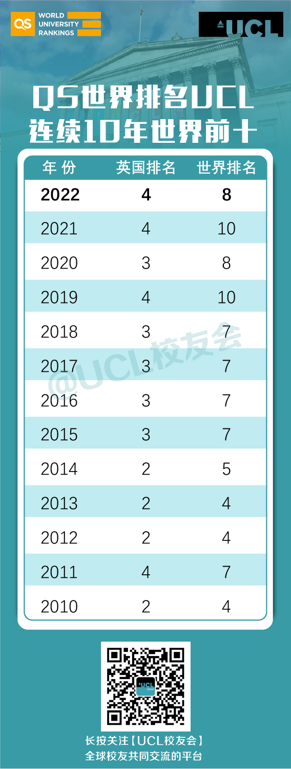 從2010年QS發布世界大學排名以來,UCL一直都穩居世界前十,英國前四!