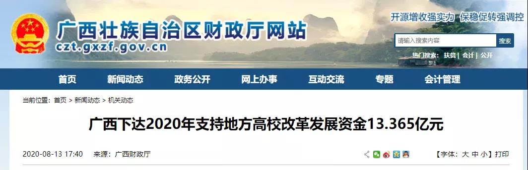 2020年8月,廣西再次砸下“真金白銀”,下達2020年支持地方高校改革發展資金13.365億元,用于提高區內本科高校生均撥款、支持廣西大學“省部合建”和“雙一流”建設及本科高校152個特色專業及實驗實訓教學基地(中心)建設。