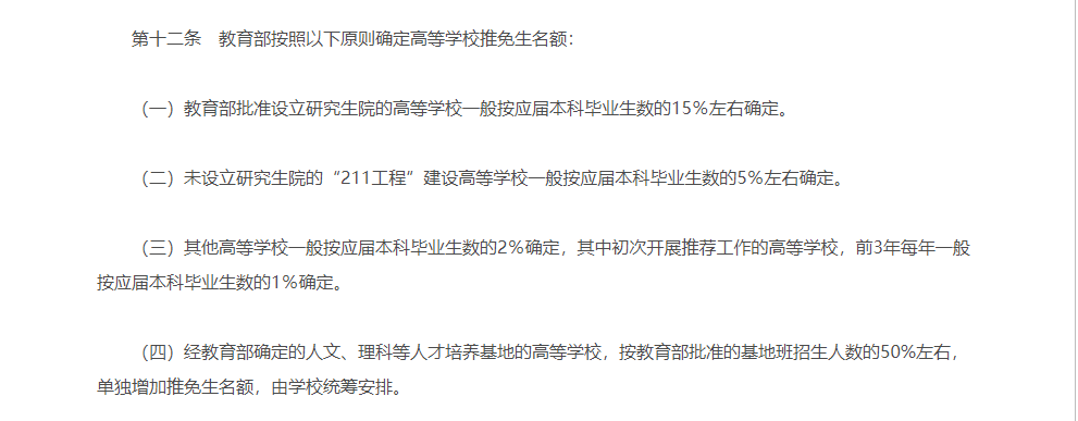 設有研究生院的高等學校接收該校推免生的人數,不得超過該校推免生總數的65%,其中地處西部省份或軍工、礦業、石油、地質、農林等特殊類型的高等學校,上述比例可適當放寬,但不得超過75%。