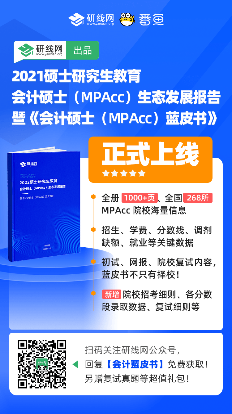 《2021年會計擇校藍皮書》從考研形勢、擇校、網(wǎng)報、初試、復試、調(diào)劑到錄取七大階段入手,完整覆蓋全國268所招生院校,學制學費、招錄人數(shù)、復試分數(shù)、初復試政策、調(diào)劑名額、就業(yè)質(zhì)量等內(nèi)容。