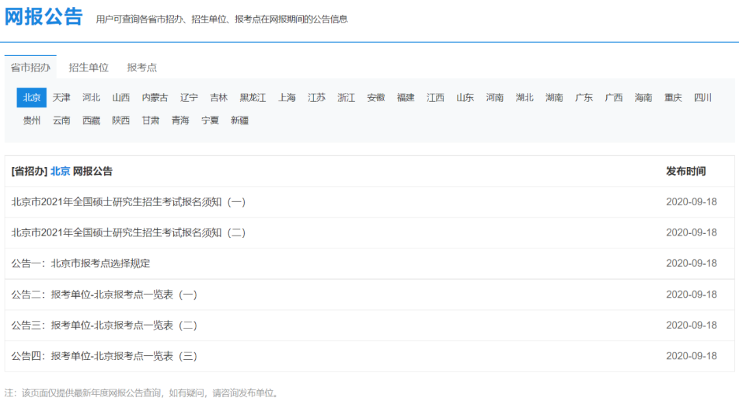 考生需要注意的是,每一年的預報名開始前,各省市招辦、招生單位、報考點就開始在網報公告版塊陸續更新公告,提醒考生相應的注意事項。請及時關注。