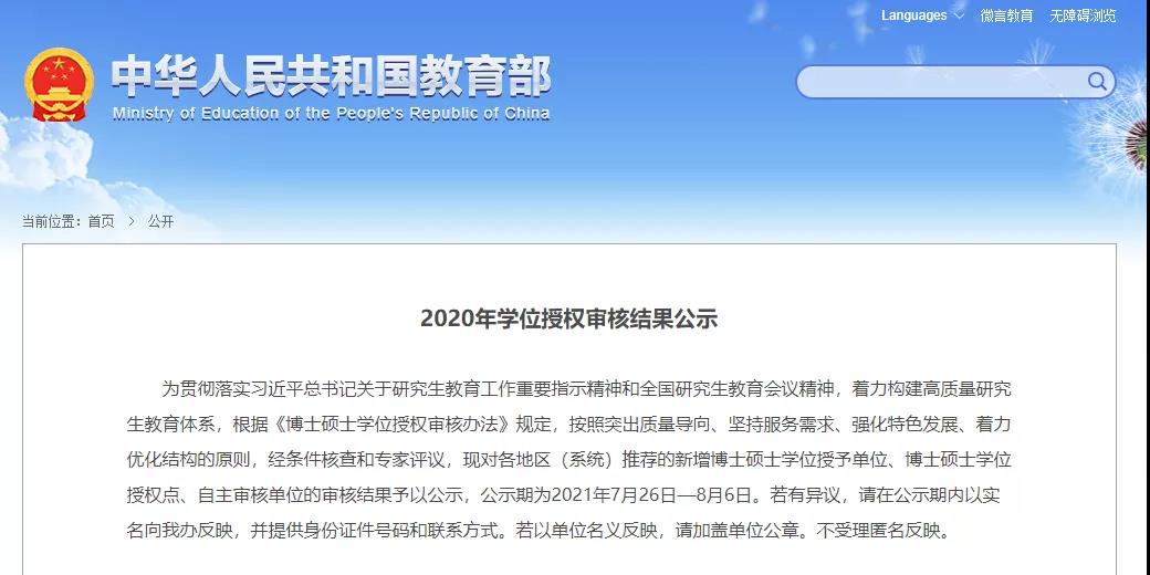 根據《博士碩士學位授權審核辦法》規定,按照突出質量導向、堅持服務需求、強化特色發展、著力優化結構的原則,經條件核查和專家評議,現對各地區(系統)推薦的新增博士碩士學位授予單位、博士碩士學位授權點、自主審核單位的審核結果予以公示,公示期為2021年7月26日—8月6日。若有異議,請在公示期內以實名向我辦反映,并提供身份證件號碼和聯系方式。若以單位名義反映,請加蓋單位公章。不受理匿名反映。