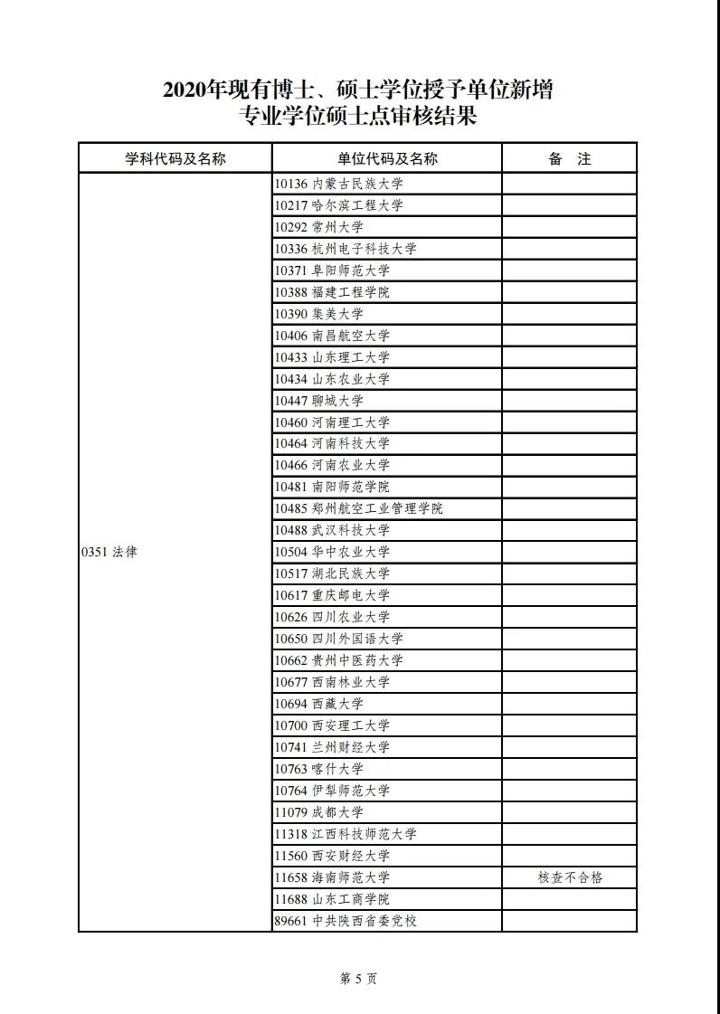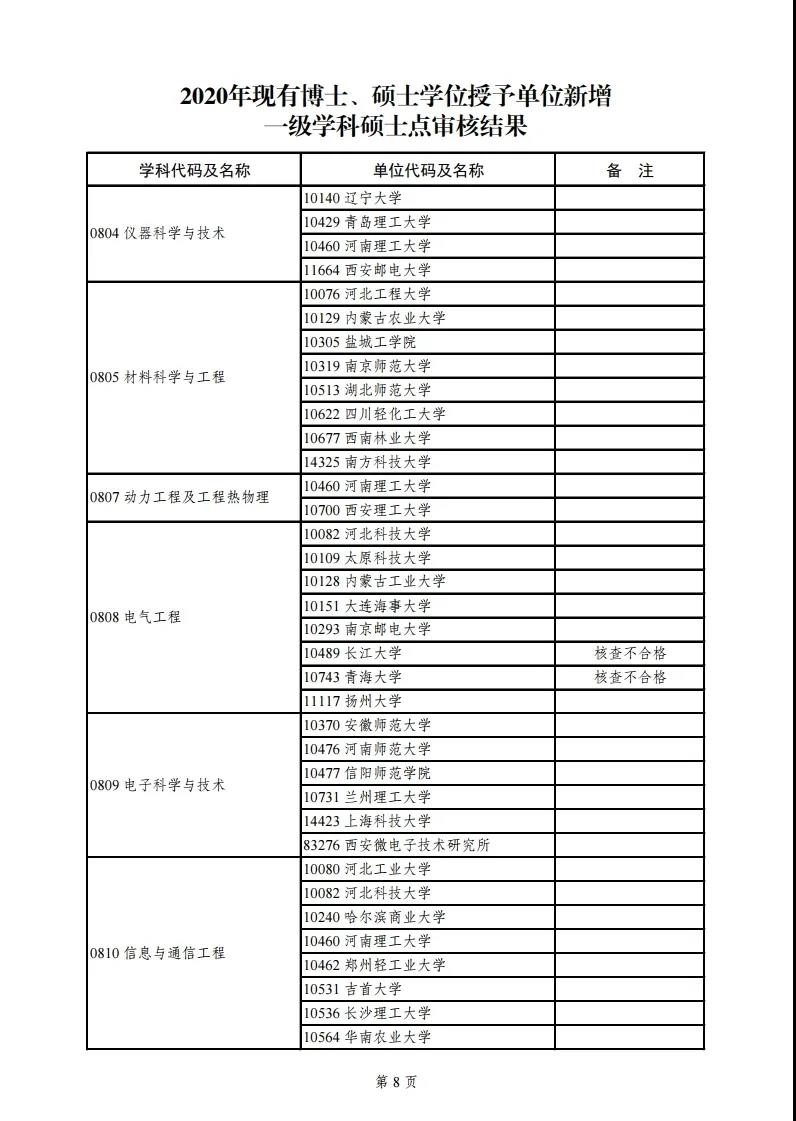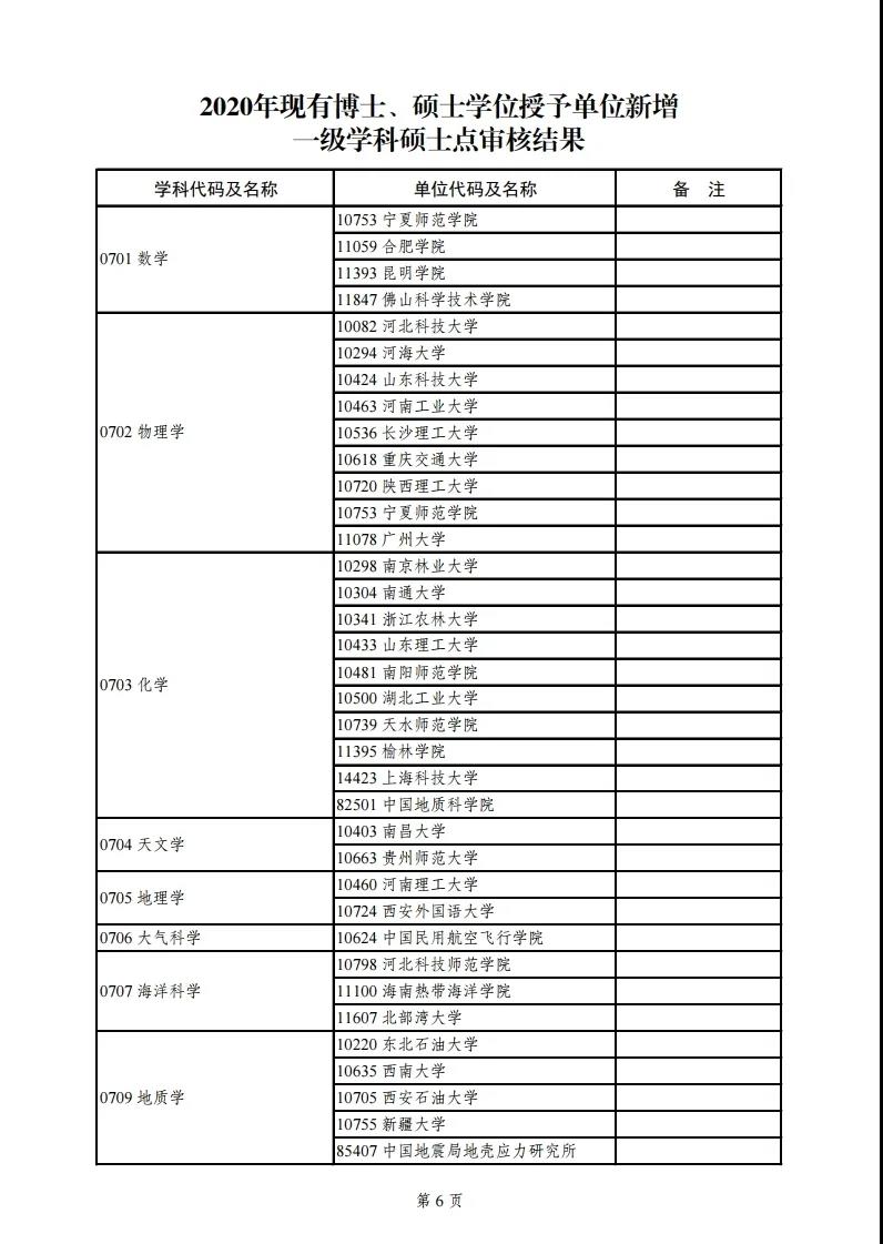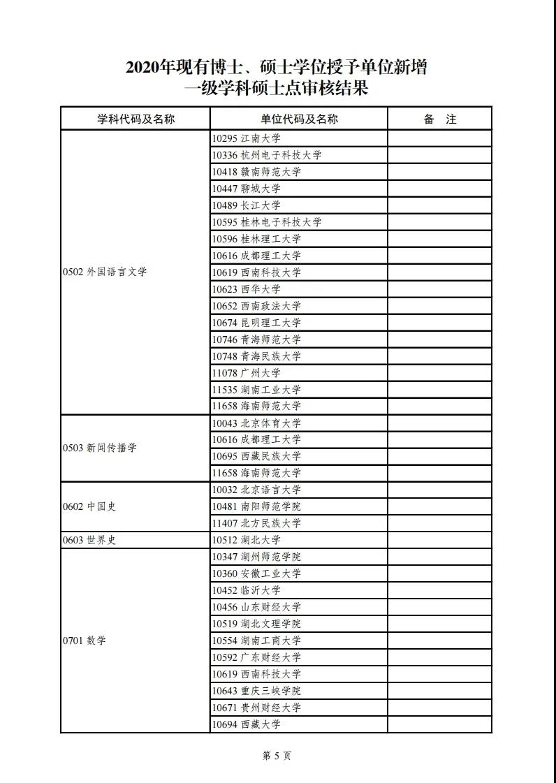 5.2020年現有博士、碩士學位授予單位新增一級學科碩士點審核結果(部分)