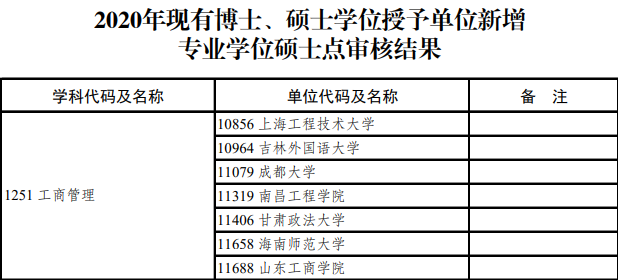在《2020年學(xué)位授權(quán)審核結(jié)果公示》中,新增管理類聯(lián)考(七大專業(yè))專業(yè)學(xué)位碩士共計(jì)178個(gè),以下是詳細(xì)名單: