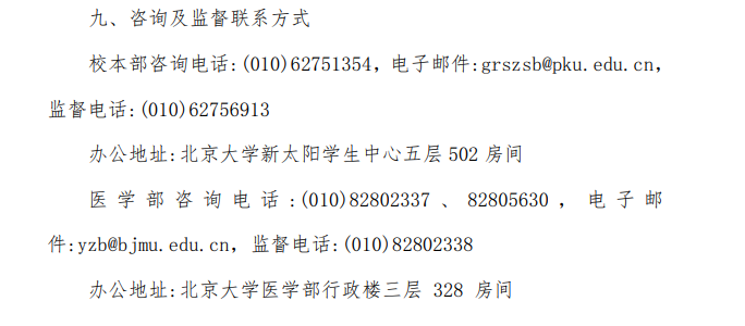 很多考生往往會忽視這一途徑,如果同學們無法在以上的文件中搜集到較為有效的信息,那么可以直接通過撥打招生辦電話來進行咨詢,一般情況下,院校的招生官網、招生簡章、復試工作辦法中都會公布學校/學院的招生電話,撥打前注意理清自己的疑問,在老師解答的過程中做好記錄,并注意撥打電話的時間,如周一到周五,早9:00-17:00。以北京大學為例: