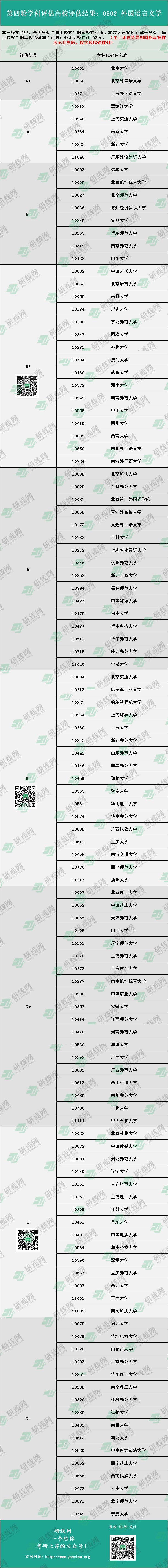 下面是全國第四輪學科評估結果[0502 外國語言文學]的院校排名,供大家擇校參考。(注:評估結果相同的高校排序不分先后,按學校代碼排列)