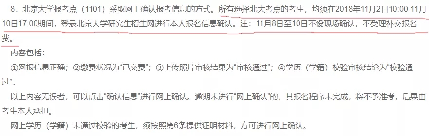現(xiàn)場確認指考生通過網(wǎng)上報名后攜帶有效身份證件到網(wǎng)上報名時選定的報考點確認報名信息。必須要現(xiàn)場確認,除非官方考試網(wǎng)上說可以進行網(wǎng)上確認,才可以不去。例如:北京大學研究生招生網(wǎng)就明確說明了北京大學現(xiàn)場確認需要在北京大學研究生招生網(wǎng)進行本人報名信息確認,不設現(xiàn)場確認!具體內容如圖: