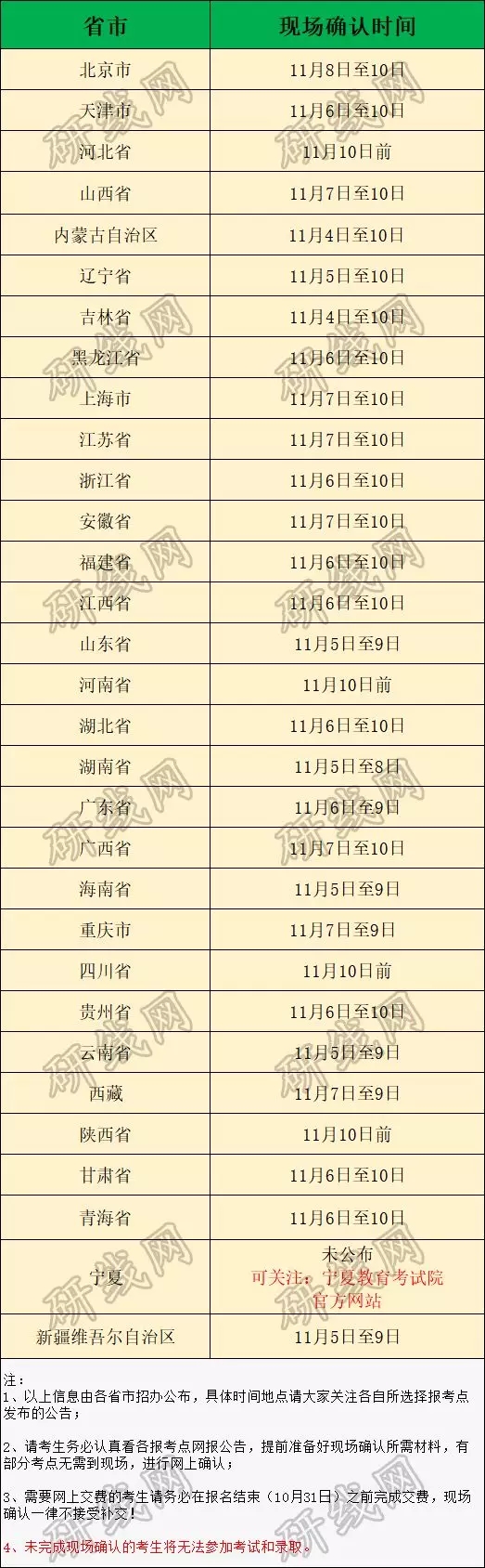 研線菌將全國各地區(qū)的現(xiàn)場確認時間做了如下匯總,同樣大家也可以在網(wǎng)報公告中看到!