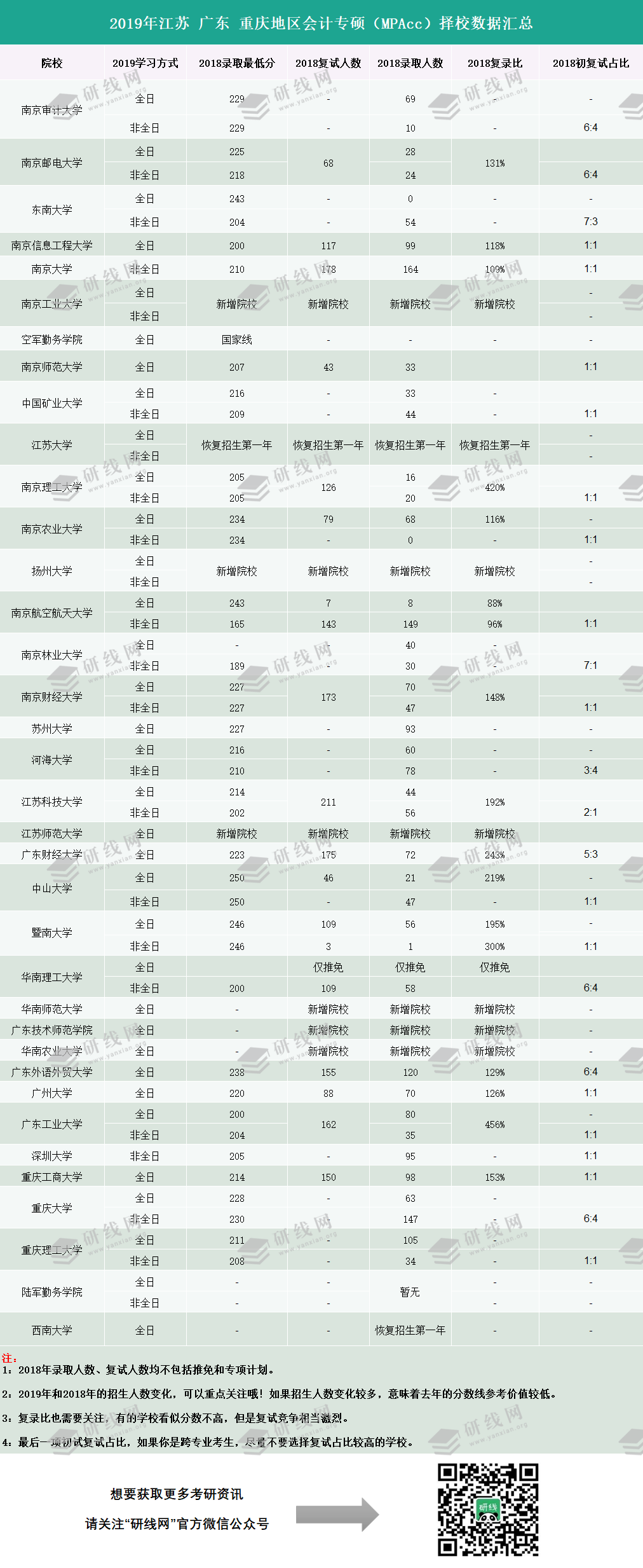 以上是江蘇、廣東、重慶地區會計專碩(MPAcc)擇校數據匯總,提供給大家參考!具體情況查詢各院校官網,希望大家都能報考到理想院校。