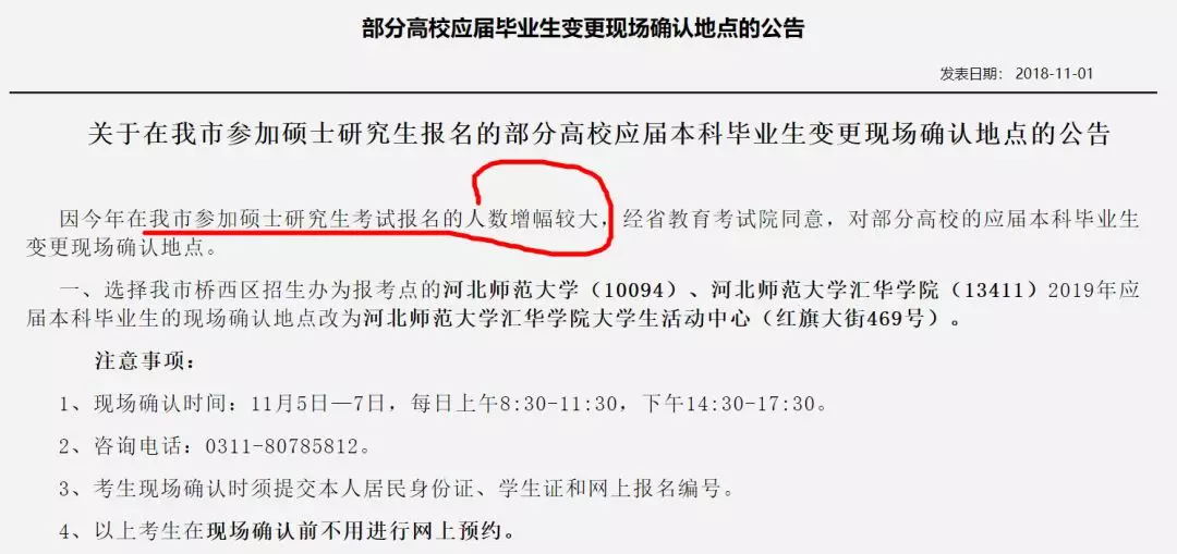 今年各地報名人數(shù)增多,導(dǎo)致有些地區(qū)現(xiàn)場確認程序改變,所以大家一定要及時關(guān)注自己所選報考點的官方公告。除了研招網(wǎng),還要查看各省市教育考試院的官方公告,因為研招網(wǎng)上面的公告也是轉(zhuǎn)載自各省市官網(wǎng)的通知,就比如說上面石家莊的通知,研線網(wǎng)小編在研招網(wǎng)上面并沒有看到,所以報考石家莊的同學(xué)尤其要注意了。