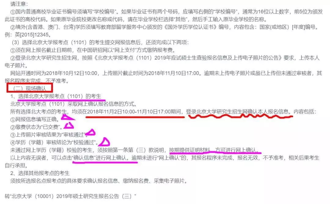 所有選擇北大考點的考生,均須在2018年11月2日10:00-11月10日17:00期間,登錄北京大學(xué)研究生招生網(wǎng)進行本人報名信息確認。注:11月8日至10日不設(shè)現(xiàn)場確認,不受理補交報名費。