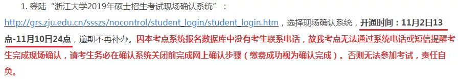 浙江大學(xué)報考點11月2日13點至10日24點(逾期不再補辦),登陸“浙江大學(xué)2019年碩士招生考試現(xiàn)場確認系統(tǒng)”,填寫信息,上傳照片,網(wǎng)上繳費等按要求完成網(wǎng)上確認。考生繳費成功后視為確認完成,否則無法參加考試。