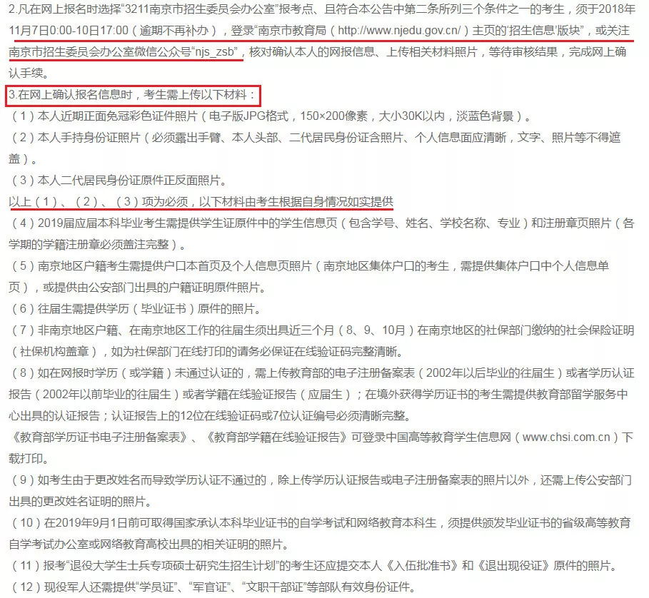 須于2018年11月7日至11月10日(逾期不再補辦),登錄南京市教育局主頁或南京市招生委員會辦公室微信公眾號“njs_zsb”,修改核對本人的網(wǎng)報信息、上傳本人證件照片、上傳身份證等其他相關(guān)材料照片,等待審核結(jié)果,完成網(wǎng)上確認手續(xù)。