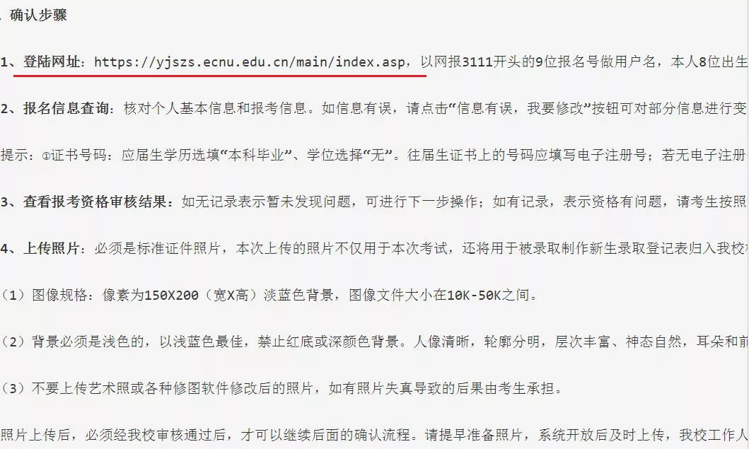 凡是符合選擇華東師范大學(xué)考點(代碼3111)條件的考生網(wǎng)上報名后,于11月6日至10日按要求上傳照片進行網(wǎng)上確認,收費系統(tǒng)11月6日不開放,于11月7日開放。
